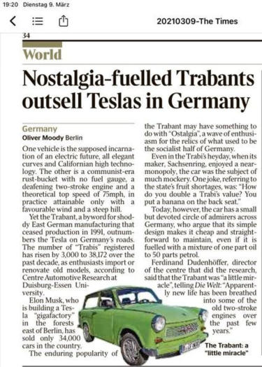 9.3.2021 Trabant und Tesla in der Zeitung "The Times"
